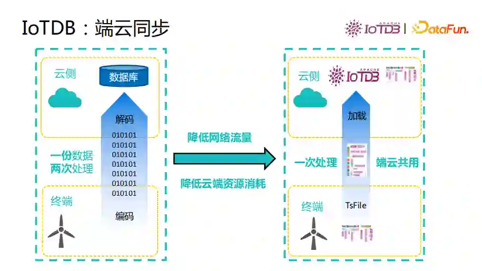 IoTDB支持端云同步。端云同步是物联网领域中常见的场景。终端设备采集数据,一条条地发送数据到云端数据库。该过程中需要在端侧对数据编码为二进制流,在云数据库侧解码数据后写入数据库。终端数据大量增长时,存在云端压力不断增加,网络带宽消耗大的现象。 对此我们提出了基于文件的数据同步方法,在终端把数据写为压缩的文件,再把文件同步到云端。由于网络传输的是压缩好的文件而不是原始数据,网络流量消耗降低。云端也不需要在解析数据后一条条地写入数据,只需要加载上传的文件即可,降低了云端CPU消耗。
