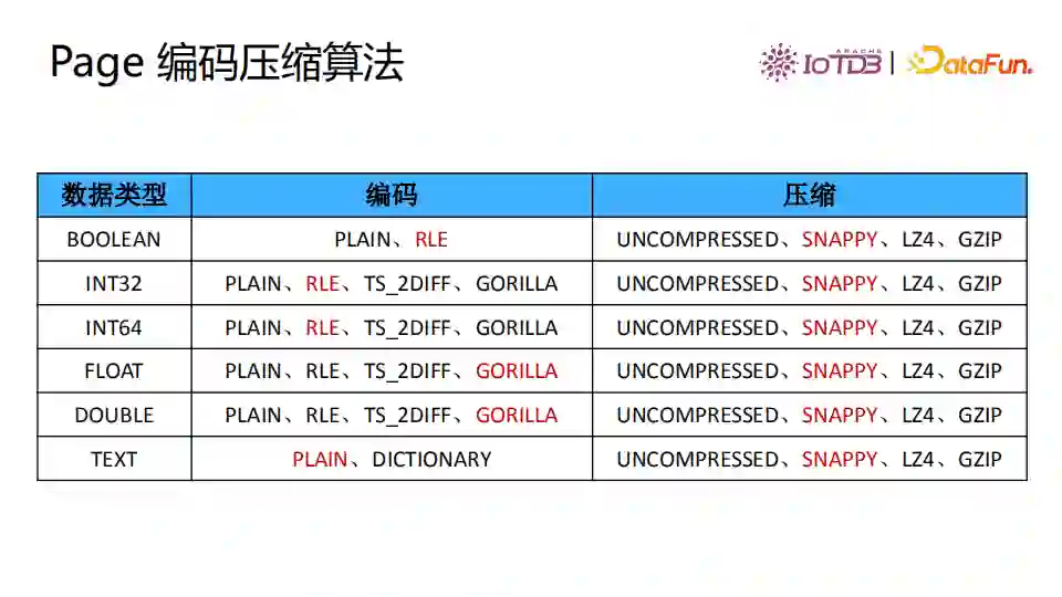 Page是数据最小粒度,可以对Page进行编码和压缩。图中展示了几种编码和压缩算法,红色的是数据类型的默认压缩编码与使用的算法。