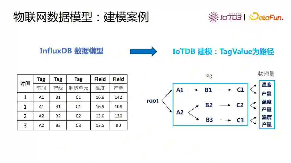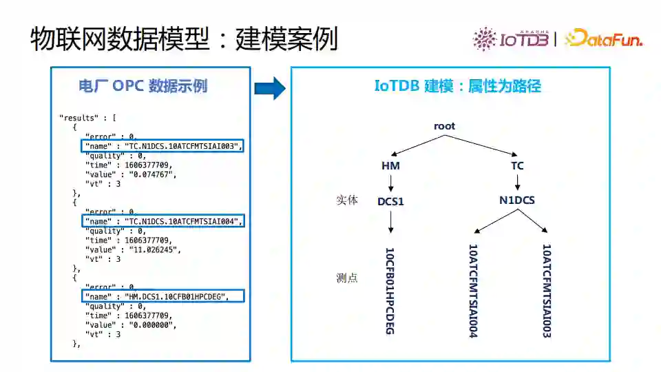 接下来我们看一些实际数据模型转化在IoTDB中建模的案例。图中是OPC Server采样的点位,这些点位是一个个Name,按点分割。这个结构和树形结构有天然的映射关系,我们可以在数据前面加一个root,按点进行树形模型拆解后构造成一棵树,映射非常自然。