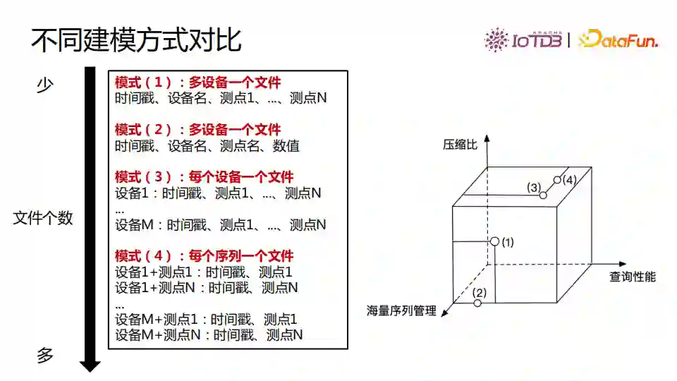 几种建模方式从文件数的角度,建模方式一和二的文件数可控,一个文件就可以存储所有数据,在文件大小超过阈值后再写入新的文件。建模三的文件数就是设备数,建模四文件数是序列数。在一个应用中希望文件数比较可控,我们更倾向使用建模一和二,整个系统的稳定性是最重要的。在存储方面,建模三和四没有冗余的数据,在一些设备数比较少时会使用建模三。建模二的冗余数据又比建模一的更多。 为什么会出现空值?一个设备假如有一万个传感器,这一万个传感器的采集时间都是一样的,此时可以存成一行,且这一行没有任何的空值。但是一旦多个传感器的采集时间不同,就无法按时间对齐,存储时会出现空值的情况,空值也会影响文件的压缩比。建模一和三都会存储空值。 由于建模方式三、四都可以规避冗余数据,因此定位速度应该是最快的。建模方式一能够避免掉一些测点的读取,建模二需要读出所有数据,所以建模二的定位速度最慢。