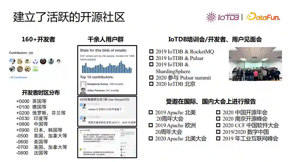 IoTDB社区目前有160多位开发者,上千人的用户群。IoTDB经常举办培训会和开发者、用户见面会。