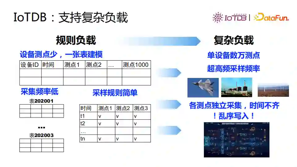 IoTDB能够支持复杂负载。传统数据库应对简单负载更加友好,但对复杂负载的处理表现不理想。简单负载中,设备测点少,采样频率低、几秒一个点甚至几分钟一个点,这种情况下表数据量小,一张表就可以满足设备一周到一个月的存储。但设备数据量大时需要进行分表,用户的使用上会造成不便。关系表也更加适用于管理规整的数据,例如一个设备的多个传感器采集时间相同,则表中不需要存储空值;但当每个设备上维护各自的时钟,独立地上报数据,此时时间难以对齐,表的数据稀疏,空值多。 复杂负载单体设备可能会产生上千甚至数万的点,如飞机采样频率比较高,转动传感器每秒钟采集几十甚至几百个数据点,或者人工去分表都难以满足需求。但IoTDB会针对这些复杂负载进行优化。