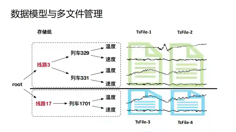 TsFile有设备、物理量(测点)、时间和值这四个状态,图中是两个TsFile的典型模型。