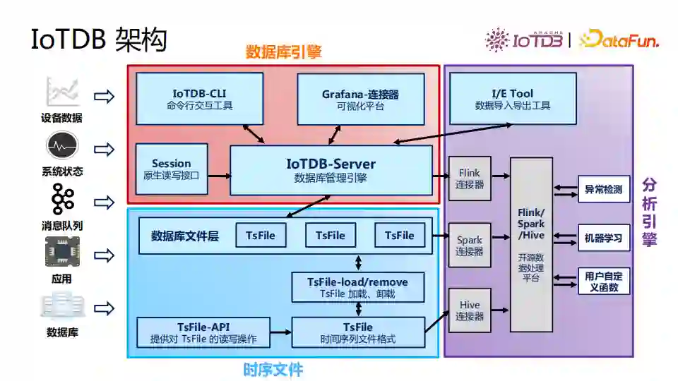 最左面是数据的来源,有设备数据、系统状态等。 数据可以通过图中蓝色部分的时序文件导入。我们提供了文件级的API,API和Parquet、ORC类似,可以对单个TsFile进行读写操作。我们把数据通过API写成TsFile文件格式后,可以通过TsFile的一些加载模块把文件加载到数据库中。此时数据文件层的TsFile是被数据库的引擎所索引的,它其实在磁盘上只是换了一个目录,我们还是能够看到这些文件。这里的文件可以加载进去再卸载出来,文件管理非常灵活。 文件层之上是数据库的引擎层。数据库的引擎能够管理多个数据文件,它还负责提供给用户更多访问数据库的接口,包括原生的读写接口session以及命令行,交互工具,还有可视化的平台。 分析引擎方面,我们开发了各种对接开源数据处理平台的连接器,IoTDB 和底层的数据文件,都可以和分析引擎进行对接。 IoTDB是一个比较开放的架构,架构的设计也是我们在不断地使用开源系统的过程中总结出来的。针对文件灵活的设计简化了数据库的运维,让我们可以随时从一个数据库里把数据文件拿来做分析。文件也可以从这个设备侧写完后再加载到数据库里去。 端侧应用的监控通常不需要非常及时,文件足够满足需求;端侧文件上传到边侧进行分析,也可以放到数据库中进行查询;云侧文件可以将文件对接Spark、Flink做数据分析,可以作为时序数据仓库使用。边侧和云测可以部署IoTDB数据库。