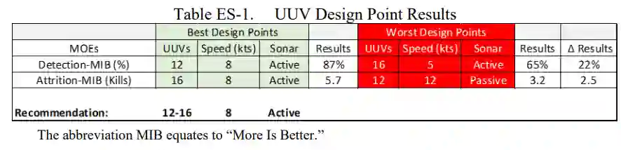 表 ES-1 列出了实验中最佳和最差的 UUV 配置。根据该表,推荐的最佳组合是一支中等规模的 UUV 舰队,以 8 节的速度航行并配备主动声纳。这种配置平均可摧毁近 88% 的敌方目标。