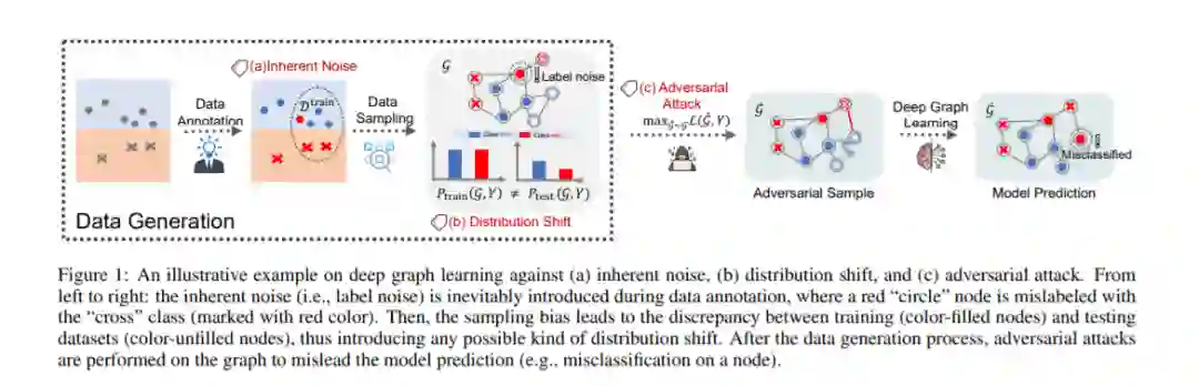 图1显示了在一个典型的深度图学习流程中不同的威胁是如何发生的。作为对比,固有噪声或分布偏移通常发生在数据生成过程中,这是由于采样偏差或环境噪声造成的,而非人为故意设计的,而对抗性攻击则是在数据生成阶段之后由恶意攻击者故意设计的(更多差异见第5节)。