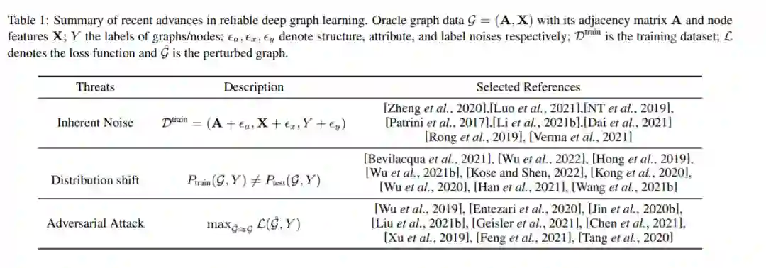 图深度学习 (Deep Graph Learning, DGL) 在商业和科学领域,包括金融、电子商务到药物和先进材料发现等应用取得了显著的进展。尽管取得了瞩目进展,但将DGL应用到实际场景中仍面临一系列的可靠性威胁,包括数据固有噪声(inherent noise),分布偏移(distribution shift) 和对抗攻击(adversarial attack)。具体来说,数据固有噪声是指图结构、节点属性和节点/图标签中与生俱来的噪声。分布偏移指的是训练和测试数据分布之间的偏移和不一致,包括领域泛化和子群偏移。对抗攻击是一种操纵性的人为手段,目的是造成模型的错误行为,典型例子包括对抗样本和后门触发器。本综述旨在提供一个关于DGL的可靠性研究最新进展的全面回顾。与之前主要关注对抗攻击和防御的相关综述相比,我们的综述涵盖了DGL的更多可靠性相关方面,即数据固有噪声和分布偏移。此外,我们还讨论了上述各方面的关系,并指出了未来研究中需要探索的一些重要问题。