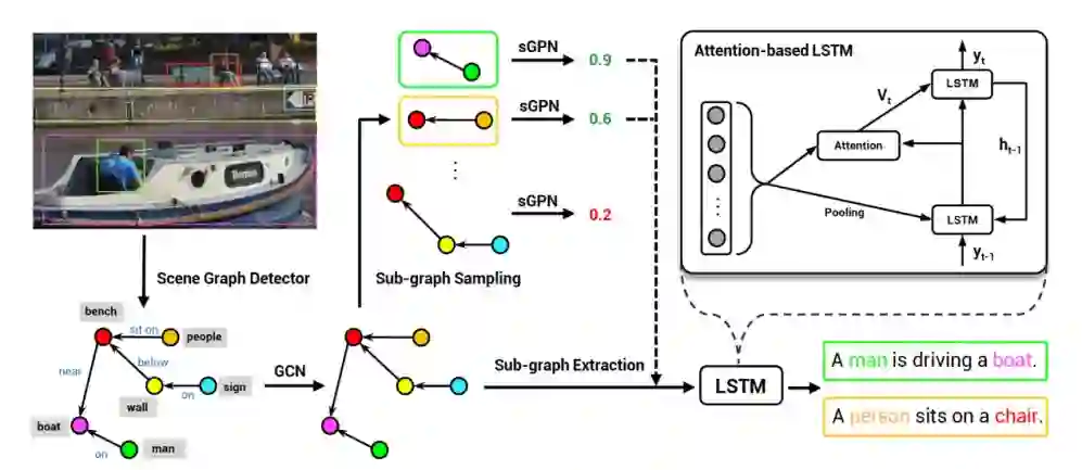 如图所示,新方法从输入图像生成场景图,并且分解为一系列子图。本文设计了一个子图生成网络(sGPN),用于学习识别有意义的子图,这些子图基于注意力的 LSTM 可以进一步解码生成句子,并且将短语匹配到图节点对应的图像区域。通过利用子图,模型可实现准确、多样化且可控制的图像描述生成。