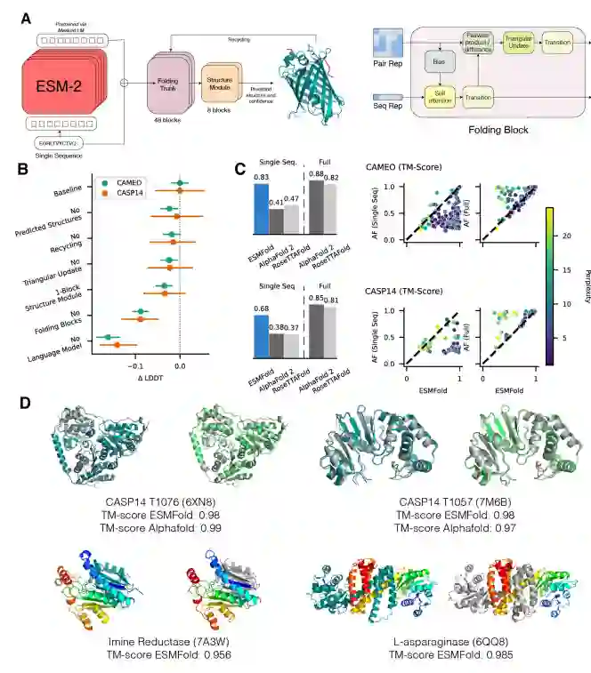 ESM-Fold 大型语言模型超越简单的模式匹配来执行更高级别的推理并生成逼真的图像和文本。虽然在较小规模上研究了针对蛋白质序列训练的语言模型,但随着规模的扩大,人们对它们对生物学的了解知之甚少。在这项工作中,研究人员训练了多达 150 亿个参数的模型,这是迄今为止要评估的最大的蛋白质语言模型。研究人员发现,随着模型的缩放,它们学习的信息能够以单个原子的分辨率预测蛋白质的三维结构。研究人员提出了 ESMFold,用于直接从蛋白质的单个序列进行高精度的端到端原子级结构预测。ESMFold 与 AlphaFold2 和 RoseTTAFold 对于语言模型可以很好理解的低困惑度序列具有相似的准确性。ESMFold 推理比 AlphaFold2 快一个数量级,从而能够在实际时间尺度上探索宏基因组蛋白的结构空间。