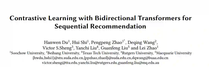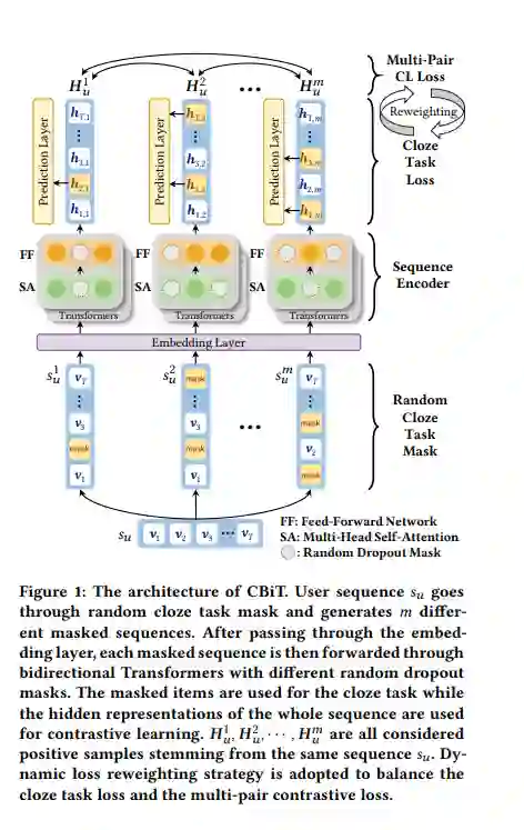 利用基于Transformer的序列编码器进行对比学习,在序列推荐方面取得了优势。它最大化了共享相似语义的成对序列扩充之间的一致性。然而,现有的序列推荐对比学习方法主要以左右单向Transformer为基础编码器,由于用户行为可能不是严格的从左到右的顺序,因此对于序列推荐来说,这种方法不是最优的。为了解决这个问题,我们提出了一种新的框架,名为对比学习与双向Transformer序列推荐(CBiT)。具体来说,我们首先在双向Transformer中对长用户序列应用滑动窗口技术,它允许对用户序列进行更细粒度的划分。然后我们结合完形填空任务掩码和dropout掩码生成高质量的正样本,进行多对对比学习,与普通的一对对比学习相比,表现出更好的性能和适应性。此外,我们还引入了一种新的动态损失加权策略来平衡完形任务损失和对比任务损失。在三个公共基准数据集上的实验结果表明,我们的模型在序列推荐方面优于最先进的模型。