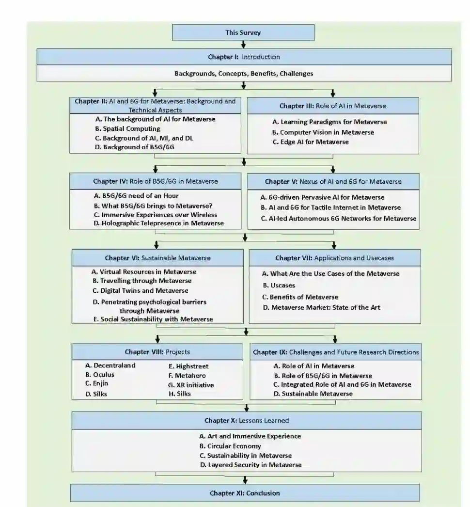 从上述讨论可以清楚地看出,现有的一些调研集中在AI、6G和相关技术的非常狭隘的视角,而其他一些调研了元宇宙在社会、经济和数字价值方面的作用。与之相反,在本综述中,我们提供了以下关键贡献: