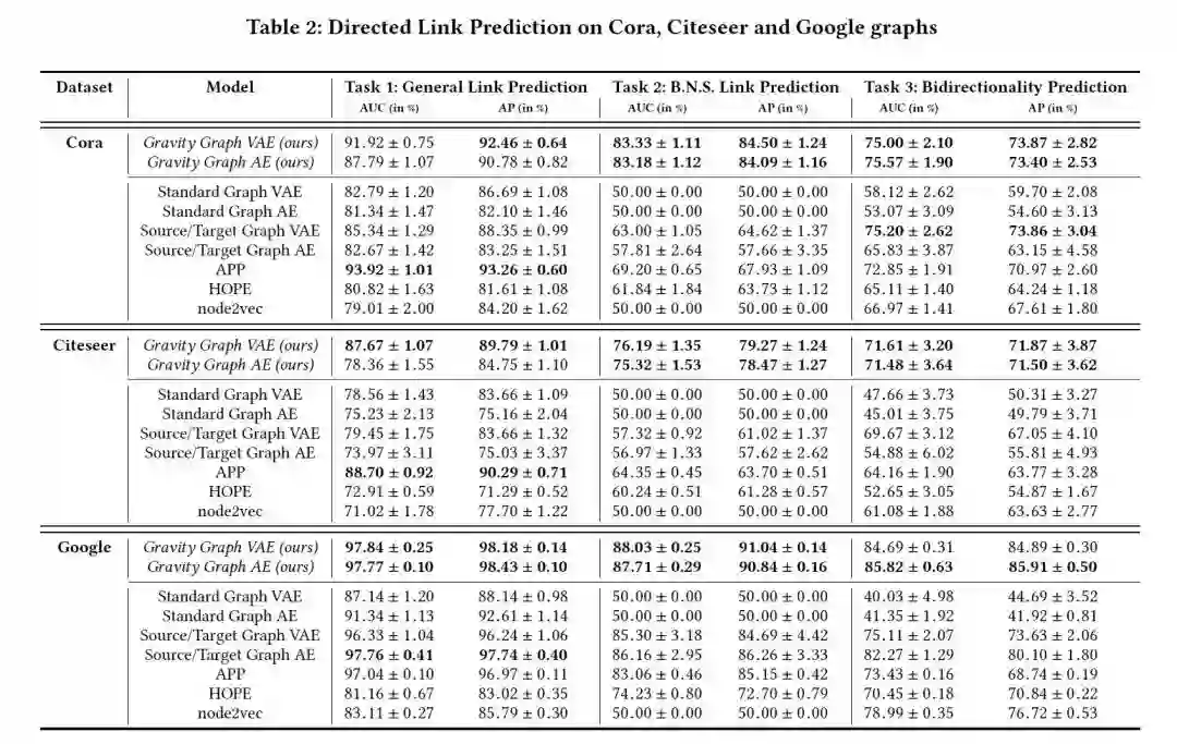 摘要:图自编码器(AE)和变分自编码器(VAE)是近年来出现的强有力的节点嵌入方法。特别是利用图AE和VAE成功地解决了具有挑战性的链路预测问题,目的是找出图上的一些节点对是否被未观察到的边所连接。然而,这些模型侧重于无向图,因此忽略了链接的潜在方向,这限制了许多实际应用程序。在本文中,我们扩展了graph AE和VAE框架来解决有向图中的链路预测问题。我们提出了一种新的gravity-inspired的解码器方案,可以有效地从节点嵌入中重建有向图。我们对标准graph AE和VAE表现较差的三种不同定向链路预测任务进行了实证评价。我们在三个真实世界的图上获得了具有竞争力的结果,超过了几个流行的baseline。