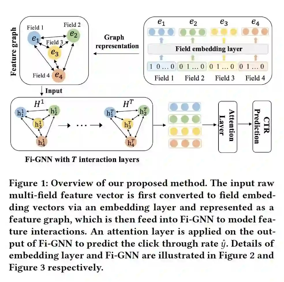 摘要:点击率(CTR)预测是在线广告和推荐系统等网络应用中的一项重要任务,其特点是多领域的。该任务的关键是对不同特征field之间的特征交互进行建模。最近提出的基于深度学习的模型遵循了一种通用的范式:首先将原始的稀疏输入multi-filed特征映射到密集的field嵌入向量中,然后简单地将其连接到深度神经网络(DNN)或其他专门设计的网络中,以学习高阶特征交互。然而,特征field的简单非结构化组合将不可避免地限制以足够灵活和显式的方式建模不同field之间复杂交互的能力。 在这项工作中,我们提出在一个图结构中直观地表示multi-field的特征,其中每个节点对应一个特征field,不同的field可以通过边进行交互。因此,建模特征交互的任务可以转换为对相应图上的节点交互进行建模。为此,我们设计了一个新的模型-Feature Interaction Graph Neural Networks (Fi-GNN)。利用图的强表征性,我们的模型不仅可以灵活、明确地对复杂的特征交互进行建模,而且可以为CTR预测提供良好的模型解释。在两个真实数据集上的实验结果显示了它的优越性。
