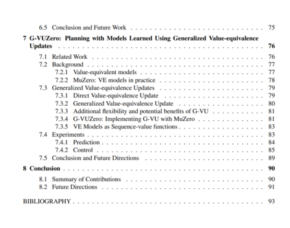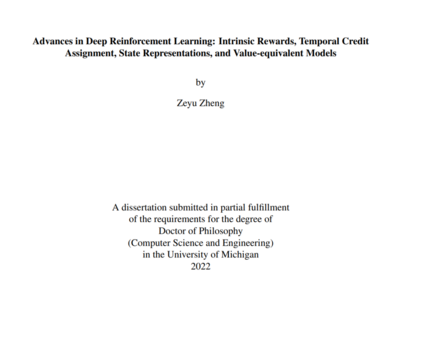 **本文旨在进一步推进深度学习技术。**具体而言,本文在以下四个方面做出了贡献:1)在奖励设计方面,提出了一种新的元学习算法,用于学习有助于策略优化的奖励函数。该算法提高了策略梯度方法的性能,并优于手工设计的启发式奖励函数。在后续研究中,学习到的奖励函数可以捕获关于长期探索和开发的知识,并可以泛化到不同的强化学习算法和环境动态的变化。2)在时间信用分配中,本文探索了基于成对权重的方法,这些权重是采取行动的状态、收到奖励的状态和之间经过的时间的函数。本文开发了一种元梯度算法,用于在策略学习期间自适应这些权重。实验表明,该方法比其他方法取得了更好的性能。3)在状态表示学习中,本文研究使用随机深度动作条件预测任务作为辅助任务,以帮助智能体学习更好的状态表示。实验表明,随机的深度动作条件预测通常可以产生比手工设计的辅助任务更好的性能。4)在模型学习和规划中,提出了一种学习价值等价模型的新方法,这是一类最近表现出强大经验性能的模型,推广了现有的方法。实验结果表明,该方法能够提高模型预测精度和下游规划过程的控制性能。