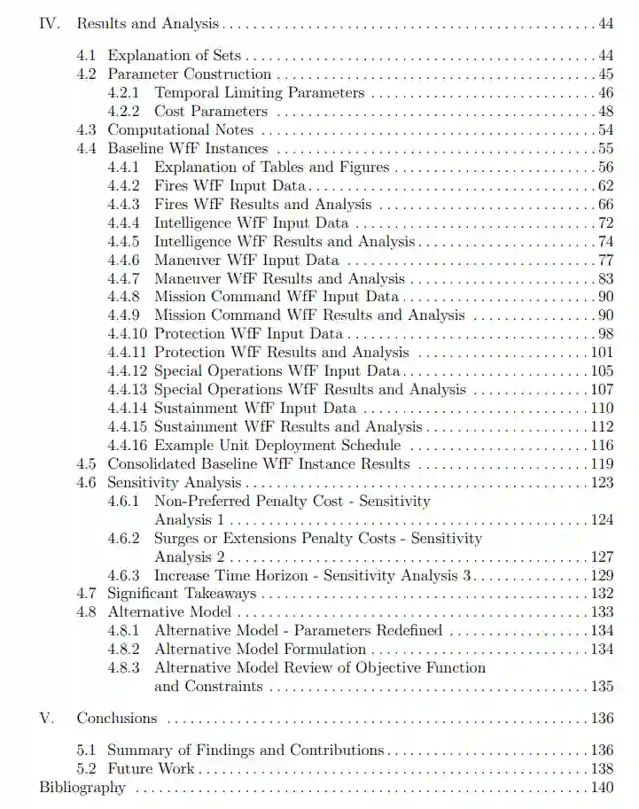 除导言一章外,本论文的结构如下。第二章概述了美国陆军如何以及为何根据 ReARMM 部署部队。本章的文献综述还概述了有关劳动力调度和劳动力充足性研究方法的相关学术文献。本论文还研究了与本研究重点相似的问题类型,包括:分配问题、集合覆盖问题、目标规划和多目标优化。第三章介绍了用于解决本研究问题陈述的整数规划编程模型。在第四章中,针对各种测试实例求解了 IP 模型,并对模型参数变化的影响进行了敏感性分析。最后,第五章总结了本研究的主要发现,并讨论了未来的研究方向。