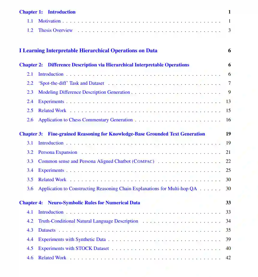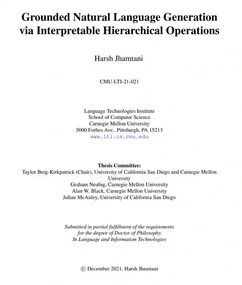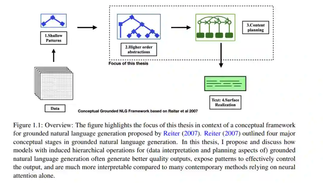 在论文的前半部分,我将讨论在不同的基础自然语言生成任务中向神经模型添加特定的离散层级操作,如图像和表格标题生成、对话响应生成以及构建多跳问题回答的推理链。这些任务涵盖了各种数据模态(包括图像、表格数据、数值数据和知识库)。在论文的后半部分,我将描述用于文本解码器中的内容规划的层级方法,研究诗歌生成中的押韵模式以及用于连贯叙事文本生成的离散计划。