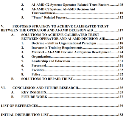 基于功能分配的操作员和AI-AMD决策辅助工具之间的人机交互研究表明,操作员和AI-AMD决策辅助工具应该被设计成在大多数杀戮链功能中作为一个 "团队"运作。这引导论文研究了单独和集体考虑人类和决策辅助的信任因素。对操作员和人工智能-AMD决策之间的人机交互的研究还显示,操作员的角色已经从手动控制器变成了监督控制器。因此,一个值得信赖的决策辅助工具是很重要的,因为操作者会期望系统的表现符合预期,以帮助操作者更好地履行他的角色。另外,为了进一步帮助减轻操作者的认知工作量,信息的外部表示、决策辅助工具的建议必须易于阅读和理解。