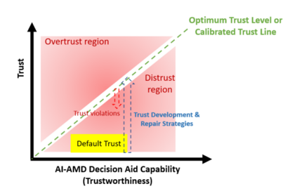 图2说明了操作员和AI-AMD决策辅助工具之间的信任框架。y轴代表人类对AI-AMD决策辅助系统的信任程度,x轴代表AI-AMD决策辅助系统的能力。绿色的45°虚线表示最佳的信任水平或校准的信任线,其中的信任与AI-AMD的能力相对应,导致正确的利用(Lee and See 2004)。过度信任由最佳信任水平线以上的区域表示,此时的信任超过了系统能力,导致误用。低于理想信任水平线的区域表示不信任,这时的信任没有达到系统能力,导致滥用。假设存在一些默认的信任水平(如黄框所示),目标是制定一个策略,以提高AI-AMD辅助决策能力的信任。在使用该系统时,可能会发生违反信任的情况,从而降低操作员的信任。因此,信任修复行动必须被纳入,以保持信任在最佳水平。