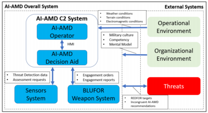 信任框架始于对系统背景的分析。图1显示了AI-AMD指挥与控制(C2)系统(包括AI-AMD操作员和决策辅助工具)及其他与之互动的子系统的背景图,这些子系统有助于操作员和AI-AMD决策辅助工具之间信任的发展。背景图使我们能够研究各系统之间的相互作用,以及它们对AI-AMD操作员和决策辅助工具之间信任动态的影响。