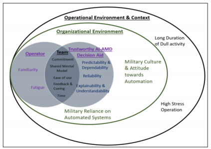 随着更先进和更快的空中和导弹威胁弹药的发展和投入使用,操作人员更需要在AMD行动中迅速作出监测。不及时的决策和反应将导致灾难性的后果。因此,人工智能是一个可能的解决方案,通过自动决策辅助工具加快和加强决策过程。这些AMD自动战斗管理辅助工具可以帮助战术操作人员应对更快的决策周期、大量的数据以及需要观察的几个系统或屏幕(Galdorisi 2019)。然而,为了有效地利用人工智能能力的潜力,需要操作员的高度信任。操作员对系统的信任程度低,可能会导致人工智能-AMD系统利用不足,受到不适当的监控,或者根本不使用(Floyd, Drinkwater, and Aha 2016)。这些问题中的任何一个都可能导致操作者的工作量不必要的增加,或者任务失败的可能性。