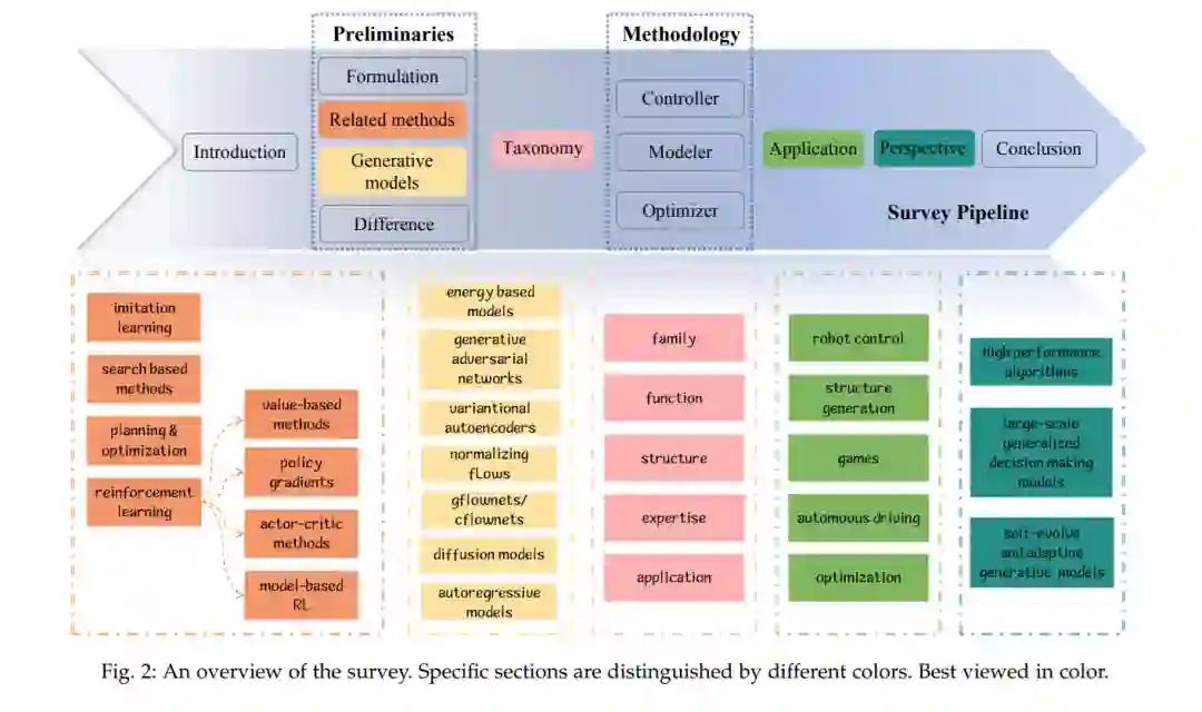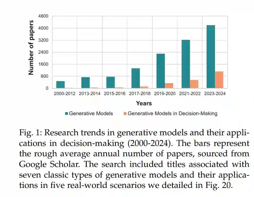 另一方面,生成模型被设计为对数据分布进行建模,而不仅仅是拟合标签。一旦训练完成,它们可以生成与原始数据相似的新样本,从而能够探索不同的场景和结果。这一能力使得在传统方法可能难以立即显现的情况下,发现新的策略成为可能。在复杂或标签不明确的数据场景中,生成模型提供了对可能决策路径的更深入理解,有时能引导出更符合高回报或期望目标的策略。然而,传统方法如优化或强化学习在决策空间较清晰、目标更直接的简单环境中仍然有效。选择这些方法之间的差异,取决于任务的复杂性和环境的特点。 认识到这些优势,近年来,开发新的生成模型并将其应用于决策制定的研究工作大幅增加。图 1 展示了生成模型及其在决策制定中的应用的研究趋势,进一步强调了这些方法在解决此类挑战中的重要性。然而,目前缺乏全面的综述,能够总结过去的工作并为新的研究方向铺平道路。这个空白促使我们撰写本文综述。该综述的三大贡献包括:1)提出了一个全面的分类法,用于分类当前的生成决策制定方法。我们识别了七种用于决策制定的生成模型,并将其功能分类为三个关键角色:控制器、建模器和优化器;2)我们回顾了生成模型在决策制定中的多样化实际应用,重点讨论了机器人控制、结构生成、游戏、自动驾驶和优化任务;3)最后,我们总结了现有工作的优缺点,并讨论了未来在决策制定任务中开发高性能生成模型的前景。 本文其余部分的组织结构如下(参见图 2 了解总体大纲):第二部分作为引言,介绍了序列决策制定的基本公式,并提供了所有研究方法的基础知识。具体而言,我们详细介绍了七种生成模型,并将它们与传统方法进行对比。第三部分提出了用于分类生成决策制定方法的分类法。第四部分根据介绍的分类法回顾并分析现有文献。第五部分展示了生成模型在决策制定中的实际应用。最后,第六部分讨论了生成模型在决策制定中的未来发展方向,第七部分总结了本文的整体内容。