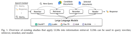 在这项综述中,我们深入探讨了LLMs和IR系统的融合,包括查询重写器、检索器、重新排序器和读取器等关键方面。此外,我们还探讨了这个不断扩展领域内的有前景的方向。