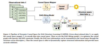 从纯观测数据中发现因果结构(即,因果发现),旨在识别变量之间的因果关系,是机器学习中的基本任务。最近的可微分基于得分的DAG学习器的发明是关键的推动者,它将组合优化问题转变为具有DAG约束的可微分优化问题,这个约束位于有向图空间上。尽管这些前沿的DAG学习器取得了巨大成功,但它们结合了独立于DAG-ness的得分函数来评估有向图候选项,而忽视了考虑图结构。结果,仅考量数据适应性而不考虑DAG-ness不可避免地导致了发现次优的DAG和模型的脆弱性。为此,我们提出了一种动态的因果空间用于DAG结构学习,我们称之为CASPER,它将图结构融入到得分函数中作为一种新的测量方法,在因果空间中忠实地反映出估计的DAG和基准DAG之间的因果距离。CASPER修订了学习过程,并通过对DAG-ness的自适应关注来增强DAG结构学习。经验可视化验证,CASPER作为空间,满足了一系列期望的特性,如结构意识和对噪声的鲁棒性。在合成数据和实际数据集上的广泛实验清楚地验证了我们的CASPER在准确性和鲁棒性方面超越了最先进的因果发现方法。