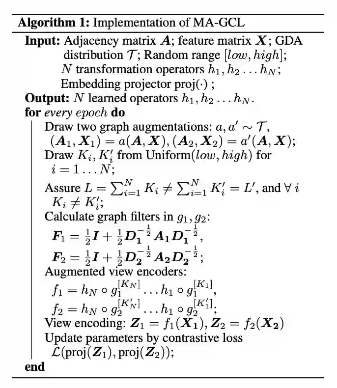 基于三种模型增强策略,我们提出了一种新的图对比学习模型MA-GCL,其伪代码如下: