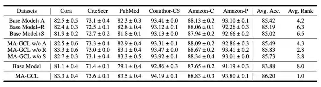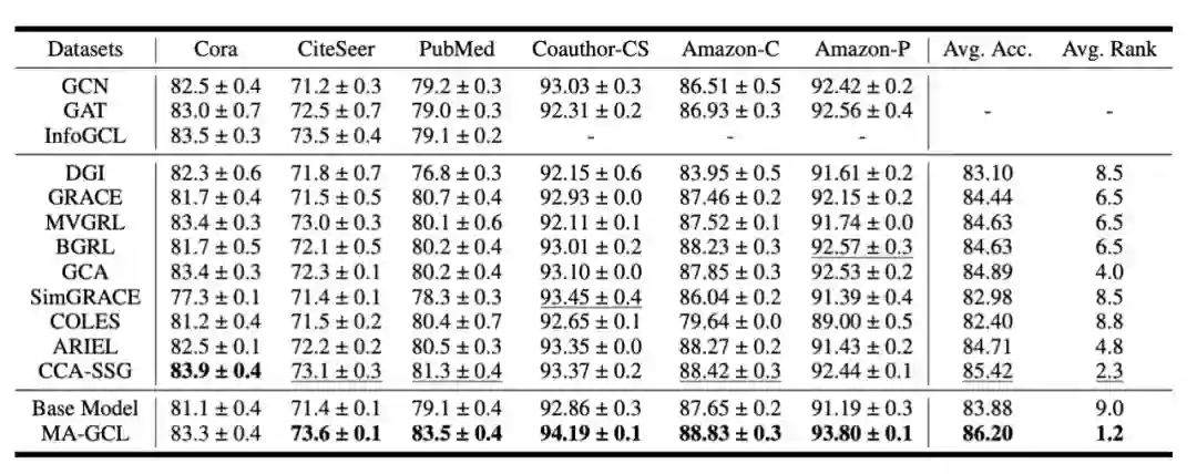MA-GCL在六个节点分类数据集上的五个都取得了SOTA的性能。