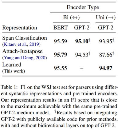 该研究学习的表示在 Penn Treebank 上达到了 93.72 F1,且每个单词只有 5 bit;在每个单词为 8 bit 时,该研究在 Penn Treebank 上达到了 94.97 F1,这和使用相同的预训练嵌入时的 SOTA 解析模型相当。该研究还对系统学习到的表示进行了分析,他们研究了系统捕获的可解释句法特征等属性,以及句法歧义的延迟解决机制。