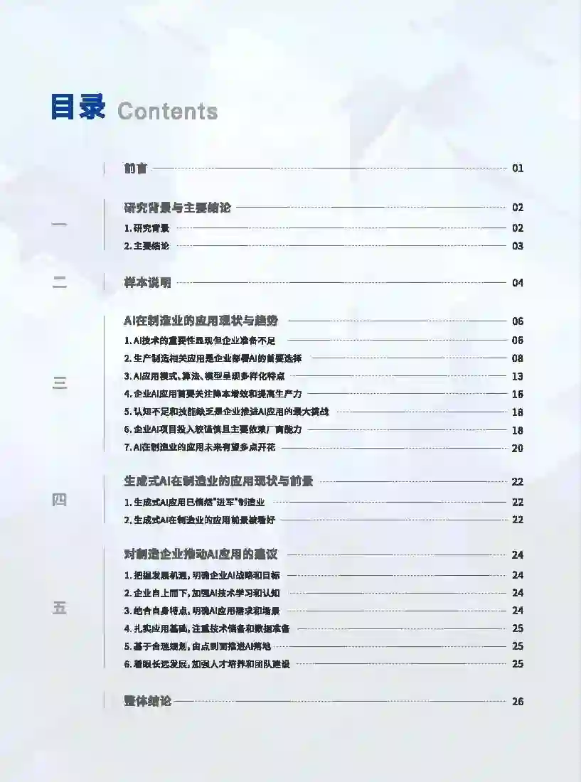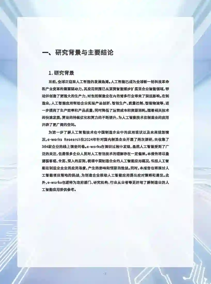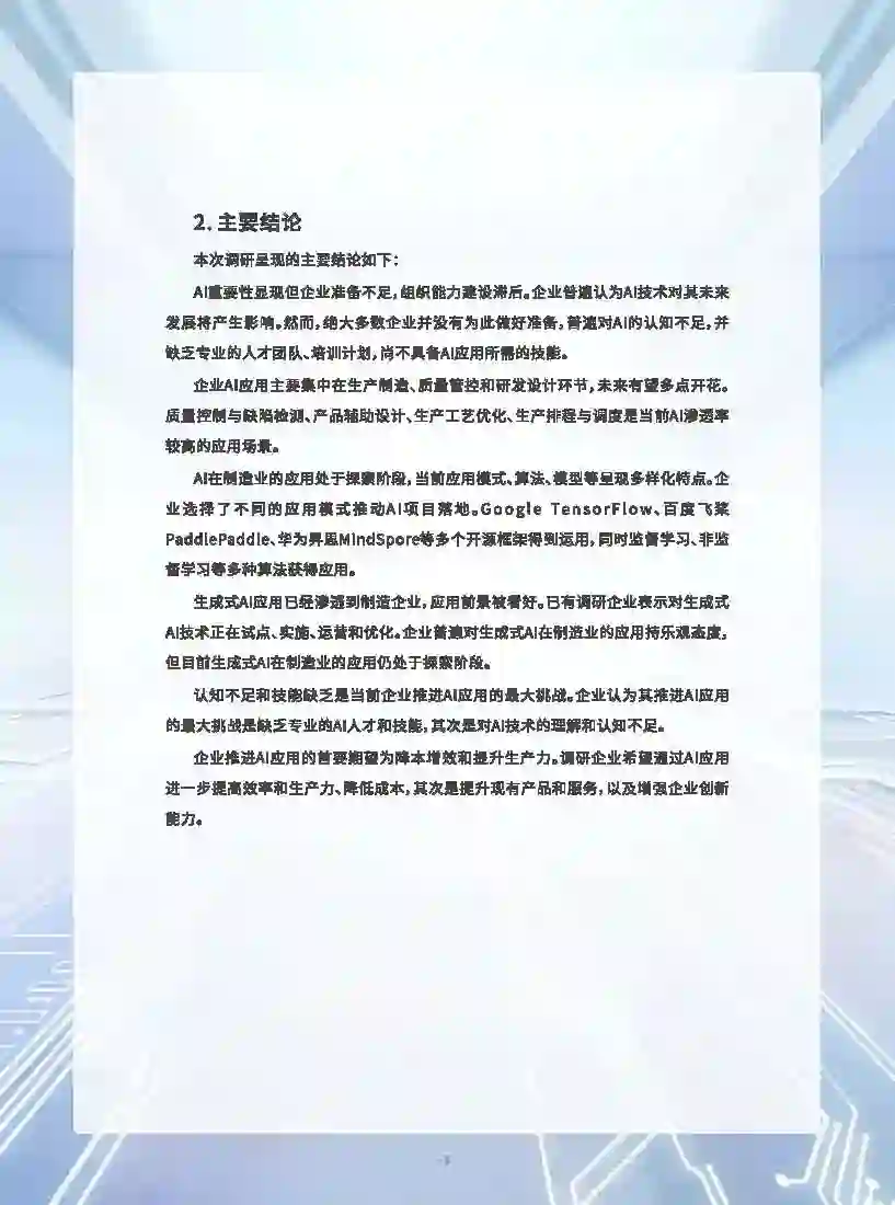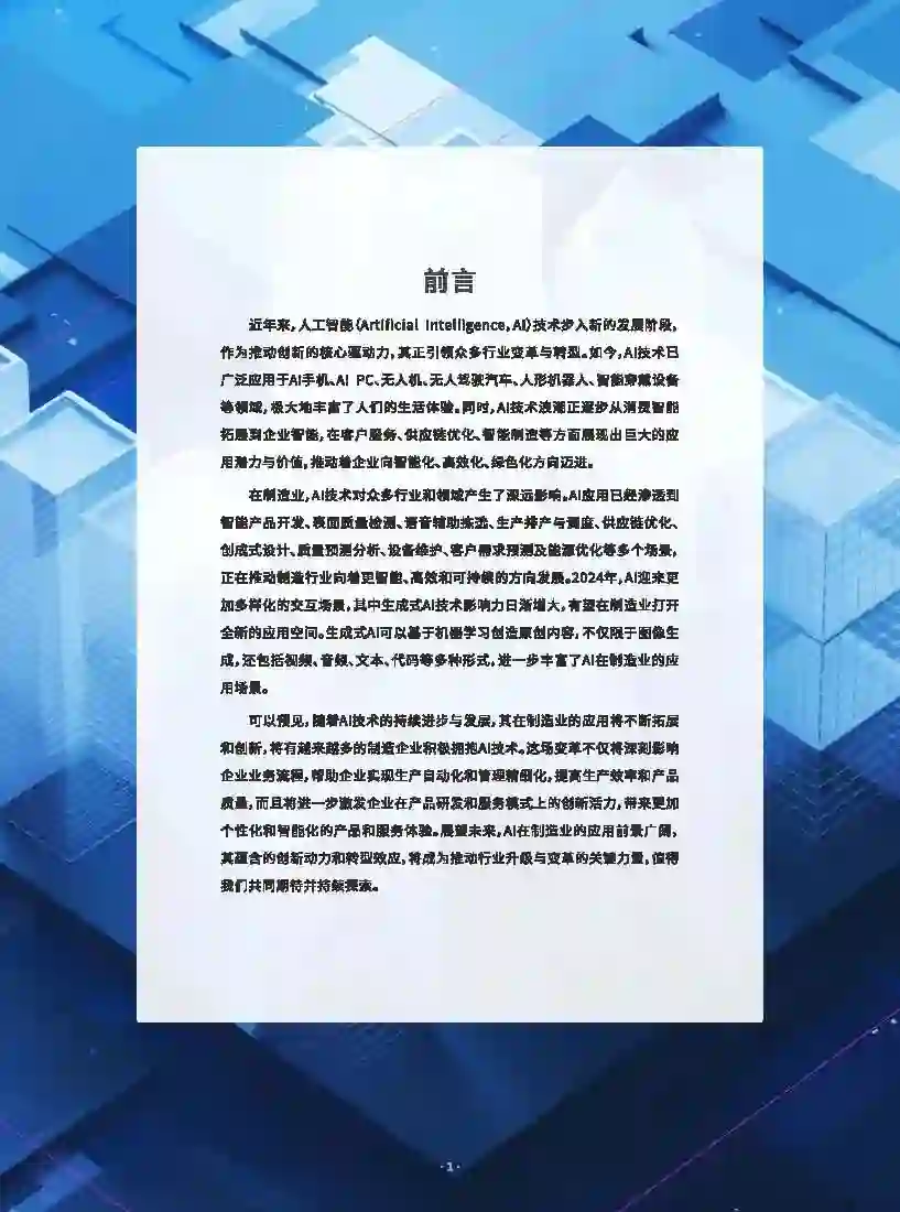 在人工智能发展日新月异的时代背景下,制造业凭借其海量数据资源和丰富多样应用场景,已成为人工智能技术应用最具潜力的领域之一 人工智能的发展势不可挡,其赋能制造业的进程已经开启。人工智能正在向制造业加速渗透,驱动制造业全链路数字化转型和智能化升级。当前,人工智能应用场景主要集中在生产制造、质量管控和研发设计环节,主要成效自标是降本增效。生成式AI技术的飞速发展获得企业的高度关注,其在制造业的潜在应用前景被企业看好。 大部分企业尚未做好全面拥抱人工智能的准备。尽管企业普遍认为人工智能技术将在企业未来发展中发挥重要作用,但很多企业对人工智能技术及其应用的认知有限、理解不深,并在针对性的专业培训体系构建、专业人才培养与储备方面存在显著不足,进而导致了企业在人才与技能方面的圈乏,定程度上制约了企业在人工智能领域的深入应用。 唯有主动迎接挑战才是应对当前发展变局的良策。面对人工智能的快速发展,制造企业应当主动适应并积极拥抱这项新技术。但在期待通过人工智能技术赋能实现创新发展的同时,企业需要避免盲目投资。企业应在实施人工智能项目之前,明确自身战略,开展多层次培训,培养专业团队,通过开展小规模项目试点,逐步积累经验,稳妥推进人工智能技术的落地应用,确保其能够与企业的发展目标深度融合。