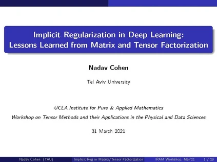 深度神经网络泛化的神秘能力被认为源于隐式正则化,一种基于梯度的优化的趋势,以拟合训练数据与低复杂度的预测器。“形式化这种直觉的一个主要挑战是,我们缺乏对复杂性的度量,既要量化,又要捕捉承认泛化的数据的本质(图像、音频、文本等)。考虑到这一挑战,我将介绍最近的隐式正则化在矩阵分解(等价于线性神经网络)和张量分解(等价于某种类型的非线性神经网络)中的分析。通过动态描述,我将建立隐式的低秩正则化,不同于任何类型的范数最小化,与先前的信念相反。然后,由于张量秩捕获非线性神经网络的隐式正则化,我将建议将其作为复杂度的度量,并表明在拟合标准数据集时它保持极低的水平。这就产生了张量秩解释神经网络的隐式正则化和将其转化为泛化的真实数据的特性的可能性。