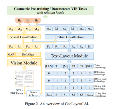 视觉信息提取(VIE)在文档智能领域中扮演着重要角色。通常,它可以分为两个任务:语义实体识别(SER)和关系抽取(RE)。最近,针对文档的预训练模型在 VIE 方面取得了显著进展,特别是在 SER 领域。然而,大多数现有模型以隐式方式学习几何表示,这对 RE 任务来说被认为是不够的,因为几何信息对 RE 尤为关键。此外,我们发现限制 RE 性能的另一个因素在于预训练阶段与 RE 微调阶段之间的目标差距。为了解决这些问题,我们在本文中提出了一种用于 VIE 的多模态框架,名为 GeoLayoutLM。GeoLayoutLM 在预训练阶段显式地对几何关系进行建模,我们称之为几何预训练。几何预训练通过三个专门设计的与几何相关的预训练任务来实现。此外,我们精心设计了新颖的关系头,这些关系头通过几何预训练任务进行预训练,并针对 RE 进行微调,以丰富和增强特征表示。根据对标准 VIE 基准的广泛实验,GeoLayoutLM 在 SER 任务中获得了非常具有竞争力的分数,并在 RE 任务中显著优于先前的最先进方法(例如,RE 在 FUNSD 上的 F1 分数从 80.35% 提高到 89.45%)。