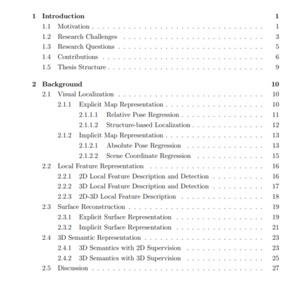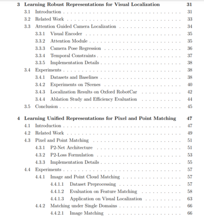 在这篇论文中,我们从单幅图像开始估计6自由度(DoF)相机姿态。为了学习对环境变化和传感器操作具有鲁棒性的场景表示,提出了一种结合自注意模块的神经网络来建模复杂的几何关系,给定的图像相对于参考环境进行拍摄。然后,基于极线几何和立体视觉的内在约束,我们构建了一个更通用的框架,在二维图像和三维点云之间寻找统一的表示形式。通过引入超宽接收机制和新的损失函数,提出了一种双全卷积框架,将2D和3D输入映射到共享的潜表示空间中,以同时描述和检测关键点,弥合2D和3D表示之间的差距。最后,我们将我们的研究扩展到开发信息表示,这通常是智能系统在现实场景中同时用于多个目的的操作所需要的。在借鉴以往基于点的网络研究成果的基础上,我们引入了一种全新的端到端神经隐式函数,它可以联合估计原始和大规模点云的精确三维曲面和语义。