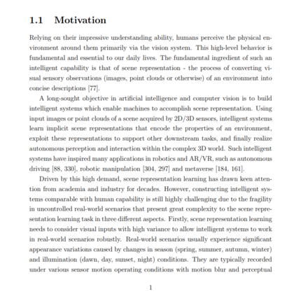 场景表示是将对环境的传感观察转换为紧凑描述的过程。这种智能行为是人工智能的基石。长期以来,科学家们一直试图重现人类理解物理环境的非凡能力。将对环境的视觉传感观察作为输入,现代智能系统主要致力于学习对基本场景属性(如几何和语义)进行编码的神经表示。这种表示可以用于支持其他下游任务,最终在复杂的3D世界中实现自主感知和交互。近年来,深度神经网络在神经场景表示中的几何和语义信息建模方面表现出色。然而,由于不受控制的现实场景的脆弱性,构建健壮的系统仍然具有很高的挑战性。由于对场景变化的传感观察的差异,不同类型的视觉表示之间的领域差距,以及对多类别信息的高效感知的要求,这为场景表示学习带来了巨大的复杂性。为克服这些挑战,本文追求鲁棒、统一和信息丰富的场景表示,从不同类型的视觉输入中学习几何和语义,为自主学习理解周围世界的智能机器铺平道路。在此背景下,本文在视觉定位、像素点匹配和语义曲面重建领域做出了三个核心贡献。