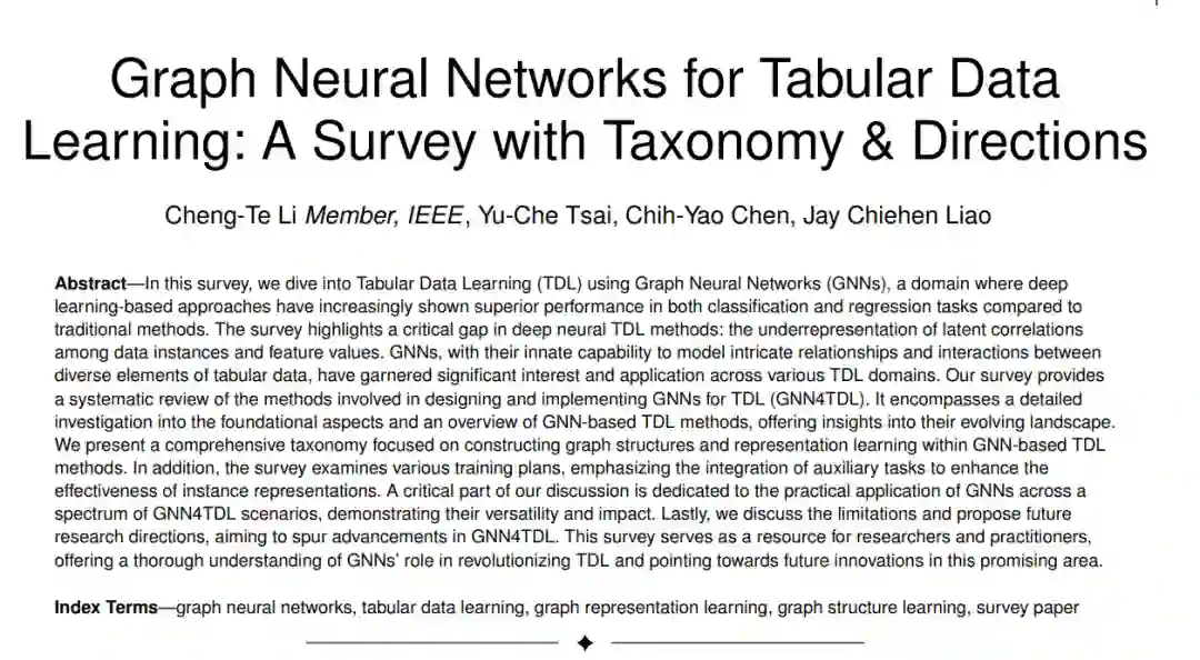 在这篇综述中,我们深入探讨了使用图神经网络(GNNs)进行表格数据学习(TDL)的领域,这是一个深度学习方法在分类和回归任务中相比传统方法表现出越来越优越性能的领域。综述强调了深度神经TDL方法的一个关键差距:数据实例和特征值之间潜在关联的欠表达。GNNs凭借其固有的模拟表格数据不同元素之间复杂关系和交互的能力,已经在各种TDL领域引起了显著的兴趣和应用。我们的综述提供了一项对设计和实现TDL用GNN(GNN4TDL)方法的系统性回顾。它包括对基础方面的详细调查和基于GNN的TDL方法的概述,提供了对其不断发展的领域的洞察。我们提出了一个全面的分类学,重点是构建图结构和在基于GNN的TDL方法中的表示学习。此外,综述还检查了各种训练计划,强调了整合辅助任务以增强实例表示的有效性。我们讨论的一个关键部分专门用于GNN在一系列GNN4TDL情景中的实际应用,展示了它们的多功能性和影响力。最后,我们讨论了限制并提出了未来的研究方向,旨在促进GNN4TDL的进步。这篇综述为研究人员和实践者提供了资源,提供了对GNN在革新TDL中角色的深入理解,并指向了这个有前景领域未来的创新。