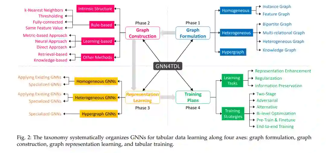 在这一部分中,我们介绍了用于表格数据学习的图神经网络(GNNs)的总体流程,并详细分类了每个关键阶段,描绘了不同方法如何实现这些阶段。伴随这种分类,我们还提供了每个类别中一些代表性框架的描述。这些研究例子展示了流程中各个阶段或类别之间复杂的相互联系,突出了它们在整体GNN4TDL过程中的紧密结合和协作功能。每个分类的详细阐述在第4节中呈现。流程。基于GNN的表格数据学习的一般流程在图1中提供。流程从图形化阶段开始,即使用表格数据集中的元素定义图的结构。这个阶段涉及决定使用哪些元素作为节点,有三种常见的方法:(1) 将数据实例表示为节点,(2) 将特征作为节点,或 (3) 两者的组合,形成不同类型的图。接下来,图构建阶段旨在在这些元素之间创建连接,将表格数据转换为图结构。这种结构由最初的形式化决定,导致形成同质图(例如,实例图或特征图)或异质图(例如,二部图、多关系图或超图)。接下来,表示学习阶段涉及根据图的性质应用不同类型的GNNs。采用各种同质实例GNNs、同质特征GNNs或异质GNNs来学习数据实例的特征表示。这一阶段至关重要,因为它决定了消息如何在图中传播,模拟特征和实例之间的交互,并影响所学习嵌入的质量。如果使用特征图,则需要额外的信息聚合层,基于学习到的特征嵌入产生最终的实例表示。最后,训练计划阶段接收最终的实例表示。在这个阶段,采用不同的学习任务和训练策略,包括在主任务旁边使用辅助任务。然后通过预测层处理结果,产生最终的预测结果。这个全面的流程突出了GNNs在处理各种图形化和学习任务方面的多功能性,最终导致有效的表格数据学习和预测。分类。根据流程,可以建立用于表格数据学习的图神经网络的分类体系。我们在图2中给出了分类。下面,我们相应地描述了分类体系中的分类,其中每个类别中的一些代表性研究被提到并在表2中总结。