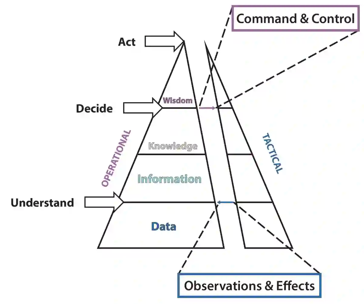 较长的作战时限为收集和使用更多数据提供了机会,但作为一把双刃剑,"作战 "一词意味着更大的部队机动计划,因此需要持续、果断和即时的行动来影响战场。而战术时间轴则更为细化,决策更为简单,因此决策所需的数据也更为精确。如果将 DIKW 金字塔想象为战斗空间内或与战斗空间有关的所有部分的总和,那么作战行动就应努力占据金字塔的最大部分。同时,战术行动应努力优化决策空间,只考虑与下一组行动相关的信息。如图 2 所示,DIKW 金字塔可细分为不同形状,以体现不同类型的行动。图中展示了一个行动杀伤链示例,包括了解环境、决定首选命令、在相对控制范围内采取行动,以便沿着智慧和知识的缝隙传递命令和控制行动。这些行动进入金字塔的环节,战术用户在这一环节中实现对其中所含意图或授权的理解,决定正确的效果和及时性并采取行动,同时将观察到的情况和效果反馈给作战环节。