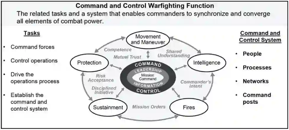 陆军理论将指挥和控制定义为 "由适当指定的指挥官对分配的和附属的部队行使权力和指导,以完成任务"。根据陆军条令出版物(ADP)6-0,指挥与控制体系由人员、程序、网络和指挥所组成。这些组成部分相辅相成,能够对部队进行有效的指挥和控制(图1)。一个组成部分的失败会降低系统的整体效力。
