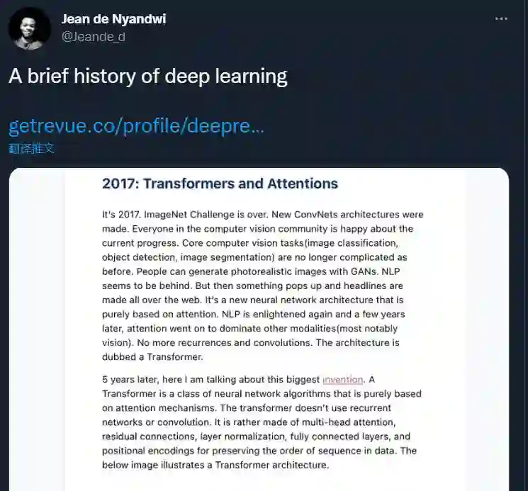 深度学习是一个非常有活力、非常宽广的领域。很难概括其中所发生的一切,作者只触及了表面,论文多到一个人读不完。很难跟踪所有内容。例如,我们没有讨论强化学习和深度学习算法,如 AlphaGo、蛋白质折叠 AlphaFold(这是最大的科学突破之一)、深度学习框架的演变(如 TensorFlow 和 PyTorch),以及深度学习硬件。或许,还有其他重要的事情构成了我们没有讨论过的深度学习历史、算法和应用程序的很大一部分。 作为一个小小的免责声明,读者可能已经注意到,作者偏向于计算机视觉的深度学习。可能还有其他专门为 NLP 设计的重要深度学习技术作者没有涉及。 此外,很难确切地知道某项特定技术是什么时候发表的,或者是谁最先发表的,因为大多数奇特的东西往往受到以前作品的启发。如有纰漏,读者可以去原文评论区与作者讨论。 原文链接:https://www.getrevue.co/profile/deeprevision/issues/a-revised-history-of-deep-learning-issue-1-1145664