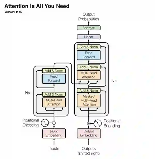 时间来到 2017 年。ImageNet 挑战赛结束了。新的卷积网络架构也被制作出来。计算机视觉社区的每个人都对当前的进展感到高兴。核心计算机视觉任务(图像分类、目标检测、图像分割)不再像以前那样复杂。人们可以使用 GAN 生成逼真的图像。NLP 似乎落后了。但是随后出现了一些事情,并且在整个网络上都成为了头条新闻:一种完全基于注意力机制的新神经网络架构横空出世。并且 NLP 再次受到启发,在随后的几年,注意力机制继续主导其他方向(最显著的是视觉)。该架构被称为 Transformer 。 在此之后的 5 年,也就是现在,我们在这里谈论一下这个最大的创新成果。Transformer 是一类纯粹基于注意力机制的神经网络算法。Transformer 不使用循环网络或卷积。它由多头注意力、残差连接、层归一化、全连接层和位置编码组成,用于保留数据中的序列顺序。下图说明了 Transformer 架构。