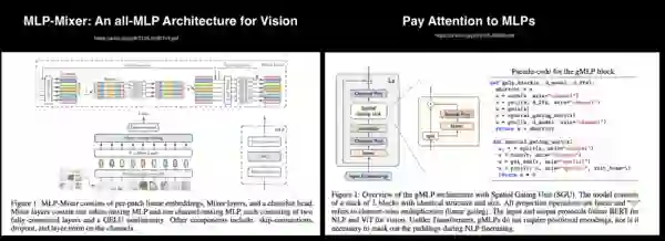 在卷积神经网络和 Transformer 兴起之前的很长一段时间里,深度学习都围绕着感知机展开。ConvNets 在取代 MLP 的各种识别任务中表现出优异的性能。视觉 Transformer 目前也展示出似乎是一个很有前途的架构。但是感知机完全死了吗?答案可能不是。 在 2021 年 7 月,两篇基于感知机的论文被发表。一个是 MLP-Mixer: An all-MLP Architecture for Vision,另一个是 Pay Attention to MLPs(gMLP) . MLP-Mixer 声称卷积和注意力都不是必需的。这篇论文仅使用多层感知机 (MLP),就在图像分类数据集上取得了很高的准确性。MLP-Mixer 的一个重要亮点是它包含两个主要的 MLP 层:一个独立应用于图像块(通道混合),另一个层跨块应用(空间混合)。 gMLP 还表明,通过避免使用自注意和卷积(当前 NLP 和 CV 的实际使用的方式),可以在不同的图像识别和 NLP 任务中实现很高的准确性。