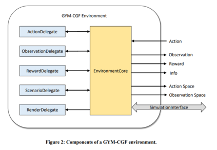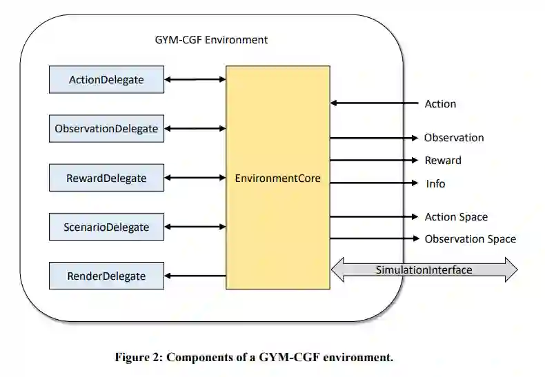 在实验中,将强化学习环境构建为实现 OpenAI Gym 接口的 Python 模块,因为许多现有的强化学习算法实现都支持该接口。环境的结构如图 2 所示。环境的大部分功能都在 EnvironmentCore 类中实现。该类通过 SimulationInterface 与本地或远程计算机上运行的仿真进程通信,在仿真中的实体和控制它们的强化学习智能体之间传输观察结果和操作。SimulationInterface 还用于在计算机生成兵力软件中加载模拟场景。