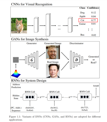 **深度神经网络(dnn)在人工智能(AI)的广泛应用中蓬勃发展。深度神经网络的普遍采用可以归因于其对不同任务的高度可定制性。**事实上,研究人员已经为不同的应用设计了DNNs的变种,例如,用于视觉识别的卷积神经网络(CNNs)、用于图像合成的生成对抗网络(GANs)、用于时间序列处理的循环神经网络(RNNs)等。所有这些变体都具有高度不同的网络拓扑和训练目标。