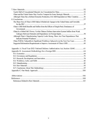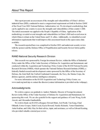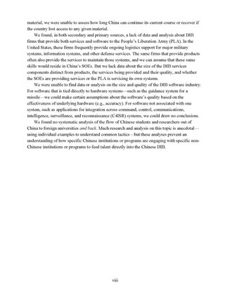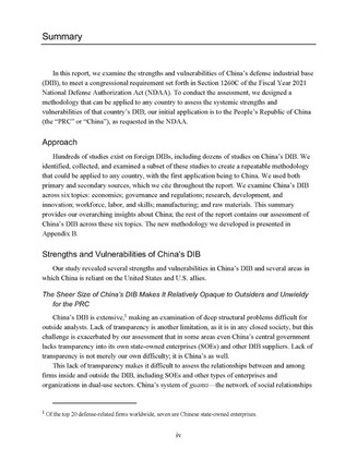 - 国防工业基础具有庞大规模但对内外均不透明报告认为:中国国防工业基础规模庞大,涵盖范围广,外部机构很难对深层次的结构性问题分析透彻,难以评估国防工业基础中国有企业与其他企业的关系,也无法充分分析民营企业在国防工业基础中的角色。甚至在某些领域,政府对国有企业和其他军工供应商也缺乏全面掌握了解。