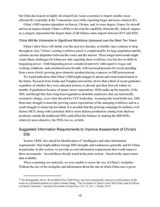- 劳动力巨大波动将在未来十年对中国产生影响报告认为:随着亚洲地区的生育率持续下降,中国的劳动力在未来20年将会萎缩。中国将面临劳动力短缺问题,特别是内地与沿海地区的收入差距使短缺问题更为复杂。国防工业部门可能难以满足新兴劳动力日益增长的职业期望,难以留住顶尖人才。