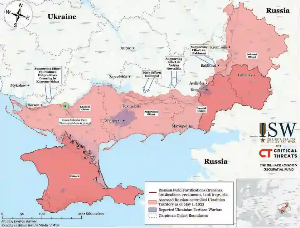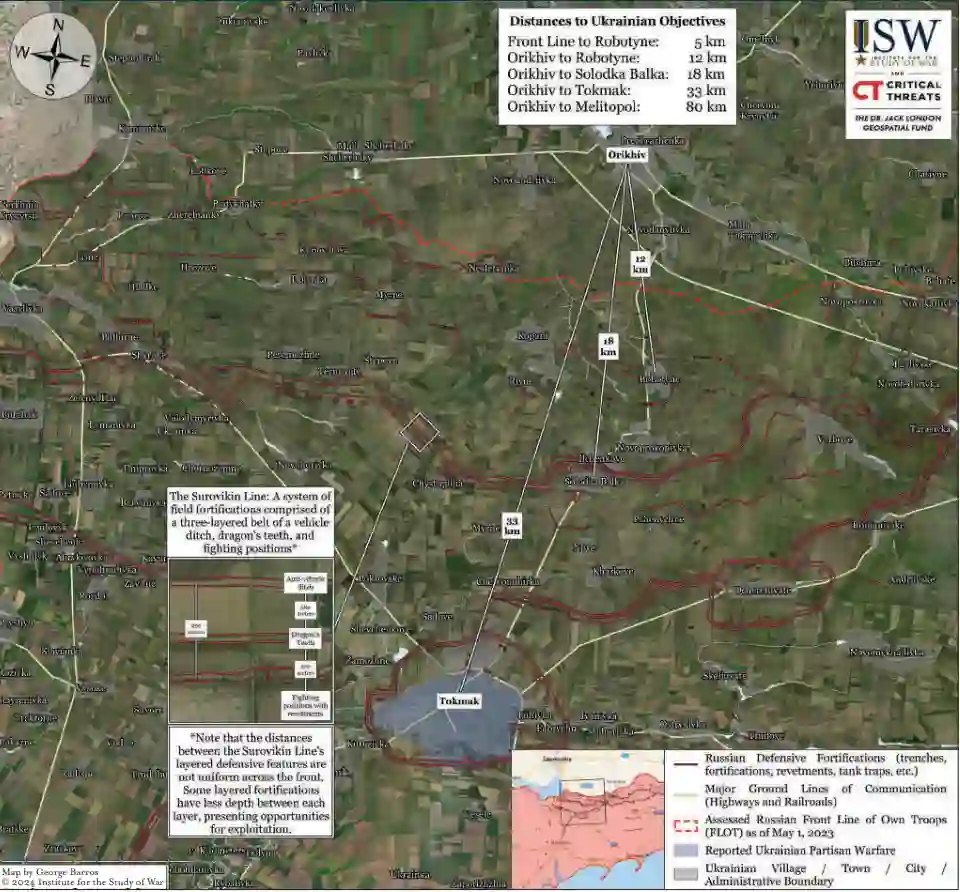 图:截至 2023 年 5 月 1 日乌克兰向梅利托波尔的主要努力的前线局势评估