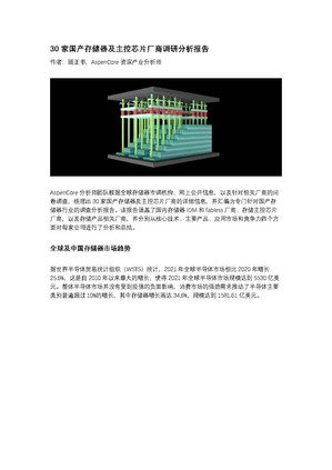AspenCore 分析师团队根据全球存储器市调机构、网上公开信息,以及针对相关厂商的问 卷调查,梳理出 30 家国产存储器及主控芯片厂商的详细信息,并汇编为专门针对国产存 储器行业的调查分析报告**。该报告涵盖了国内存储器 IDM 和 fabless 厂商、存储主控芯片 厂商,以及存储产品相关厂商,并分别从核心技术、主要产品、应用市场和竞争力四个方 面对每家公司进行了分析和总结**。