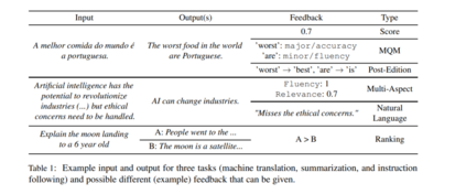要使生成系统得到广泛应用,它们必须生成的文本不仅流畅且高质量,而且要与人类的期望和规范紧密相符(Vamplew等人,2018;Hendrycks等人,2020;Kenton等人,2021a;Turner等人,2022;Ngo,2022)。实现这样雄心勃勃的目标需要现代大型语言模型(LLM)超越传统训练方法。这方面的最近改进主要集中在纳入人类反馈(Bai等人,2022b;Ouyang等人,2022;OpenAI,2023a)。这种反馈作为一种指导力量,引导LLM实现所期望的结果,就像物理机械中的反馈机制一样(Åström和Murray,2021)。通常,最先进的语言生成系统是通过使用最大似然估计(MLE)在大量数据上训练概率性的、自回归的LLM获得的。然而,用于训练这些模型的数据通常来自互联网,常常包含噪音、社会偏见和错误(Bolukbasi等人,2016;Dodge等人,2021)。当这种情况与最大化给定前面的词汇产生下一个词汇的概率的目标相结合时,可能导致目标行为的误设定(Kenton等人,2021b),并可能导致生成有毒、不准确和无益的内容(Sheng等人,2019;Bender等人,2021)。使这个问题更加严重的是,这些模型通常使用自动度量评估,它们将生成的文本与某个“参考”文本进行表层特征(如词汇重叠)比较,这些特征通常与人类感知到的文本质量不相关(Schluter,2017;Mathur等人,2020;Gehrmann等人,2022a),特别是当模型针对它们进行优化时(Paulus等人,2017;Amrhein和Sennrich,2022)。评估困难部分是因为对于许多任务来说,没有唯一的正确答案,因为相同的交际意图可以用多种方式传达。