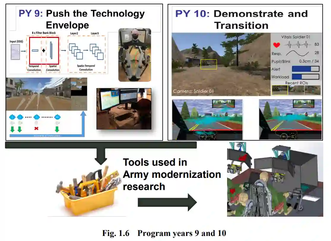 计划第 9-10 年:联盟将研究重点放在真实世界实验(如高速公路驾驶)上,同时使早期的神经成像数据探索和利用方法达到真实世界应用所需的成熟度。特别是,在被动闭环技术背景下,对解读多模态人体神经和生理数据的 ML 方法进行了改进和测试,以提高士兵的态势感知能力(上马或下马)和操作安全性(图 1.6)。此外,DAQ 和同步中间件 LSL 获得了工业界和学术界的广泛认可,并被整合到陆军的应用和高级研究项目中,以调查未来行动中的有人-无人编队协作情况。